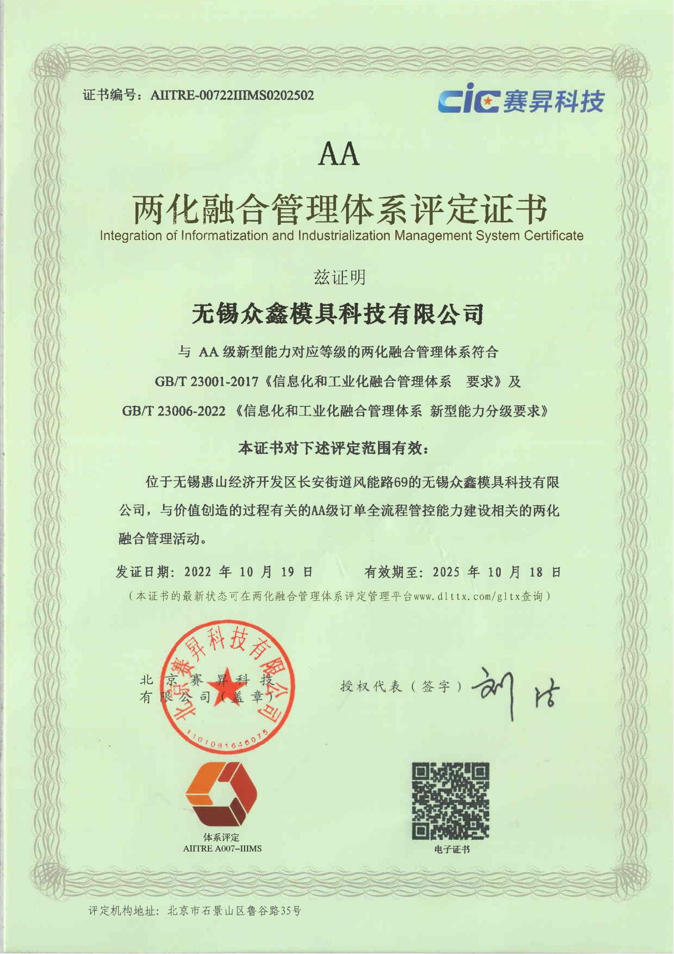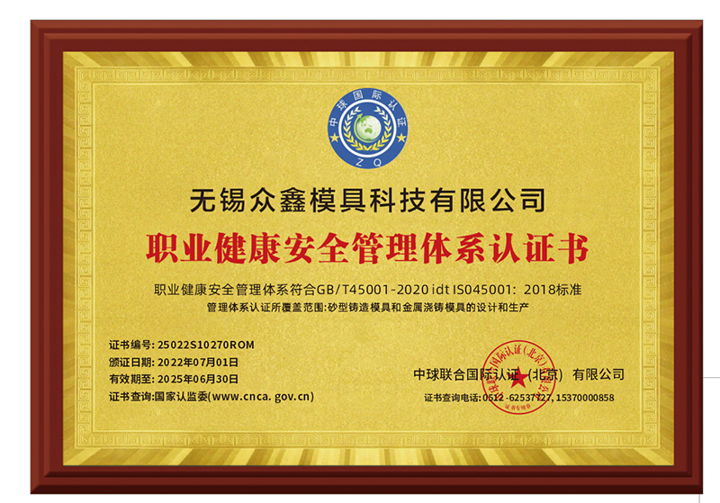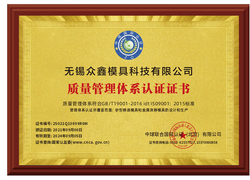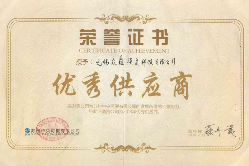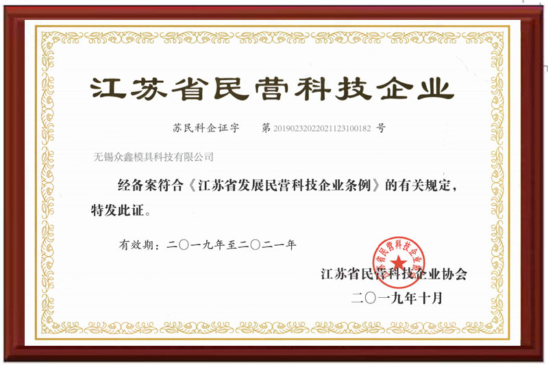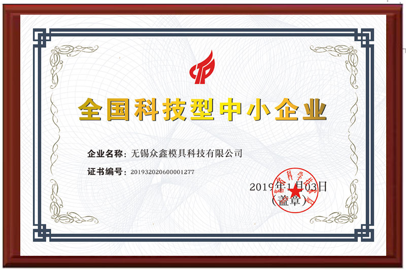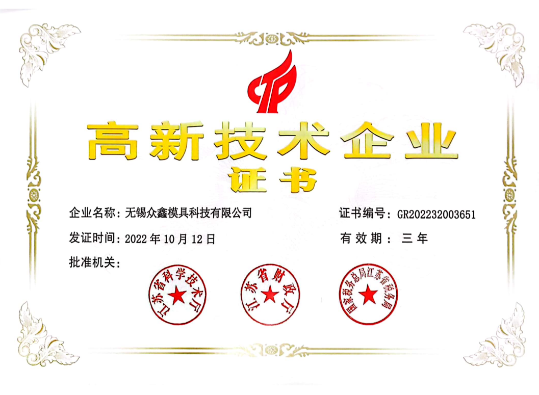 無(wú)錫眾鑫模具科技有限公司目前已通過(guò)ISO9001:2015質(zhì)量體系認(rèn)證、兩化融合管理體系認(rèn)證,獲得了高新技術(shù)企業(yè)、全國(guó)科技型中小企業(yè)、省民營(yíng)科技企業(yè)、無(wú)錫市智能車間等多項(xiàng)榮譽(yù)資質(zhì)。